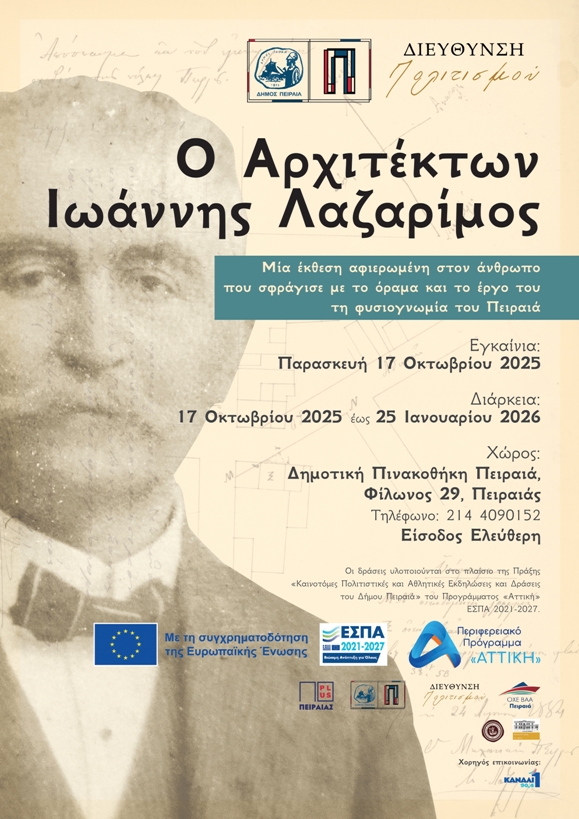 Πρόκειται για την έκθεση “Ο Αρχιτέκτων Ιωάννης Λαζαρίμος”, με ελεύθερη είσοδο για το κοινό, που οργάνωσε η διεύθυνση Πολιτισμού του Δήμου Πειραιά.