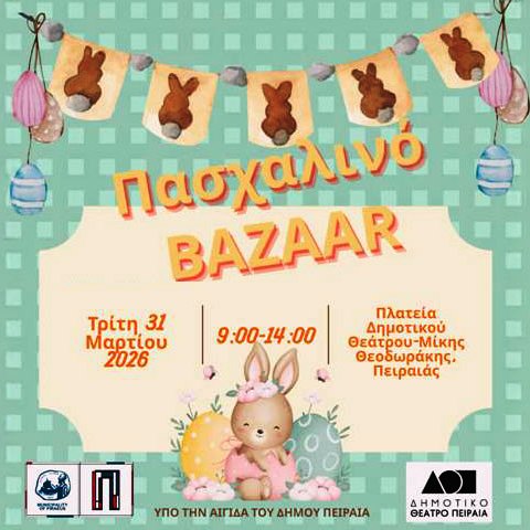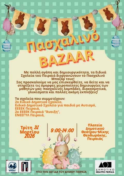 |> Ο Δήμος Πειραιά, διοργανώνει το 1ο Πασχαλινό Bazaar Ειδικών Σχολείων Πειραιά, το οποίο θα πραγματοποιηθεί αύριο Τρίτη 31, από τις 09:00 έως τις 14:00, στον προαύλιο χώρο ‘’Μίκης Θεοδωράκης’’ του Δημοτικού Θεάτρου Πειραιά.