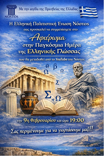 Εξ άλλου, για την αυριανή Ημέρα της Ελληνικής Γλώσσας η ελληνική πολιτιστική οργάνωση ‘’Νόστος’’ θα πραγματοποιήσει εκδήλωση στην Αργεντινή, με την αιγίδα της Πρεσβείας της Ελλάδας, που θα μεταδοθεί στις 7 μμ (ώρα Ελλάδας) μέσω Youtube (Κλικ Ε Δ Ω).