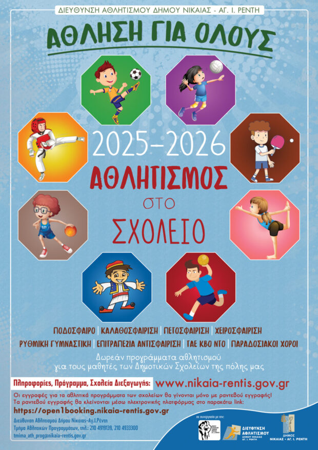 |> Ο Δήμος Νίκαιας- Αγ.Ι.Ρέντη συνεχίζει να επενδύει στη νέα γενιά με δωρεάν προγράμματα αθλητισμού για τους μαθητές των Δημοτικών Σχολείων. Το πρόγραμμα ‘’Αθλητισμός στο Σχολείο 2025-2026’’ της διεύθυνσης Αθλητισμού του Δήμου περιλαμβάνει: ποδόσφαιρο, καλαθοσφαίριση, πετοσφαίριση, χειροσφαίριση, ρυθμική γυμναστική, επιτραπέζια αντισφαίριση, ταεκβοντό και παραδοσιακούς χορούς. Με στόχο την προώθηση της άθλησης για όλους, της ευεξίας και της συνεργασίας, τα τμήματα λειτουργούν εντός των σχολικών μονάδων με εξειδικευμένους προπονητές.
