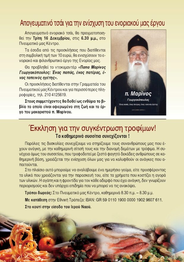 Όποιος θα ήθελε να γίνει Εθελοντής της Αγάπης διεξάγοντας τον Έρανο στην πολυκατοικία όπου διαμένει, να το δηλώσει στη Γραμματεία του Πνευματικού μας Κέντρου (τηλ.: 2104125619).