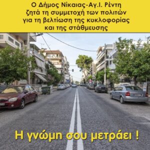 |> Κυκλοφοριακή Μελέτη και Μελέτη Στάθμευσης, εκπονεί ο Δήμος Νίκαιας – Αγ. Ι. Ρέντη, με στόχο τη βελτίωση της κυκλοφορίας στην πόλη. Η δράση περιλαμβάνει επικαιροποίηση των υφιστάμενων δεδομένων και δημιουργία βάσης για μελλοντικά σχέδια και εφαρμογές, με στόχο την αναβάθμιση των λειτουργιών … Περισσότερα