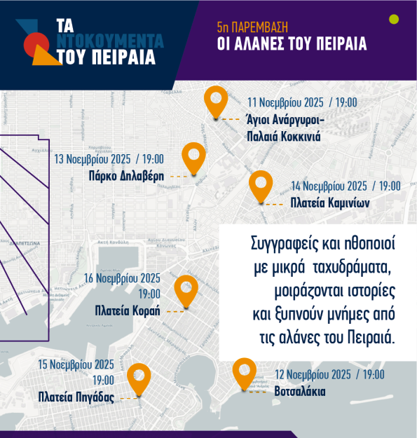 |> Οι αλάνες του Πειραιά ζωντανεύουν ξανά, μετατρέποντας τις γειτονιές της πόλης, από αύριο 11 έως και τις 16 Νοεμβρίου, στις 19:00, σε σκηνές τέχνης, μνήμης και παιχνιδιού, φιλοξενώντας την 5η καλλιτεχνική παρέμβαση, στο πλαίσιο του νέου φεστιβάλ «Τα Ντοκουμέντα του Πειραιά».