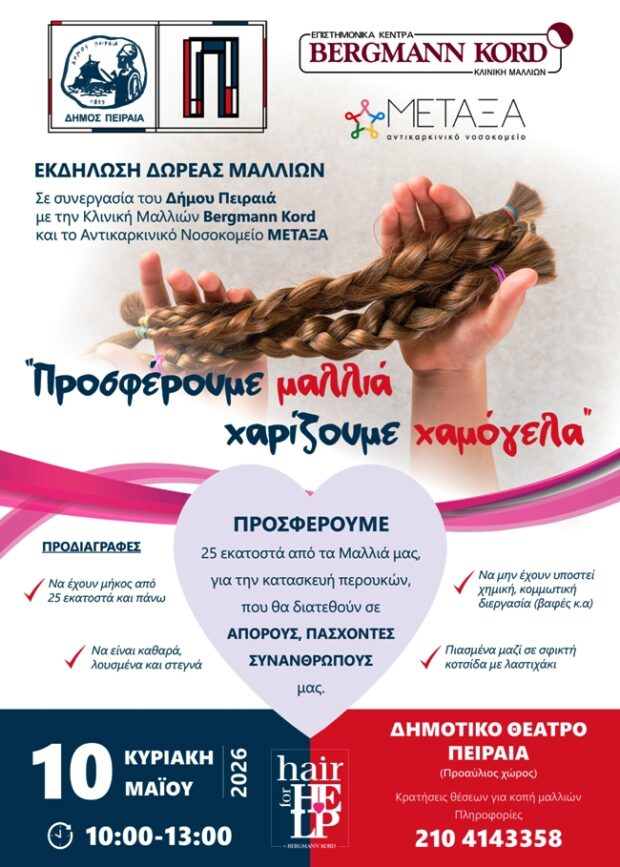 |> Ο Δήμος Πειραιά, σε συνεργασία με το Αντικαρκινικό Νοσοκομείο Πειραιά “Μεταξά” και την κλινική μαλλιών “Bergmann Kord”, απευθύνει ανοιχτό κάλεσμα συμμετοχής στην εκδήλωση δωρεάς μαλλιών.