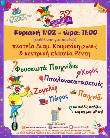 |> Ο Δήμος Νίκαιας- Αγίου Ιωάννη Ρέντη δίνει το σύνθημα για την έναρξη του 32ου Καρναβαλιού, με την πρώτη μεγάλη αποκριάτικη εκδήλωση που θα πραγματοποιηθεί αύριο Κυριακή 1η Φεβρουαρίου στις 11.00 π.μ., σε δύο κεντρικά σημεία της πόλης.